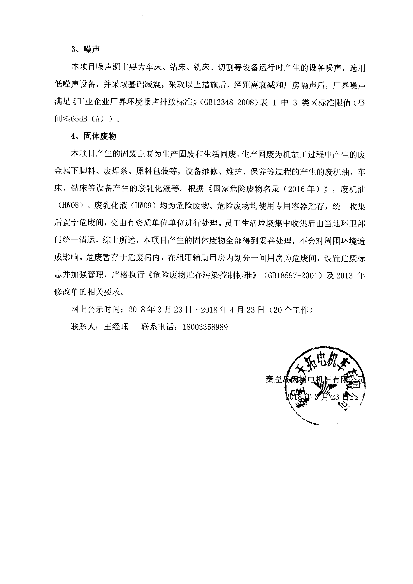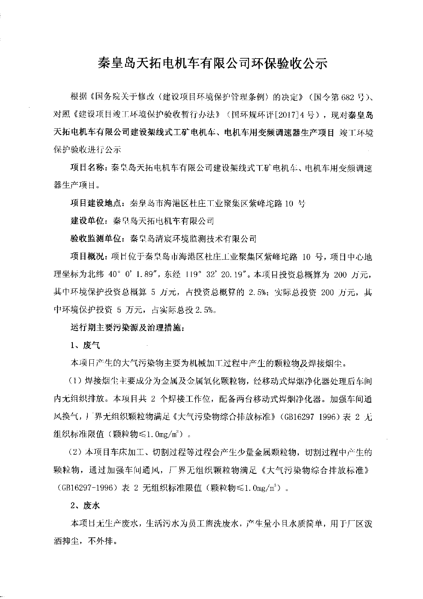 秦皇島天拓電機(jī)車(chē)有限公司環(huán)保驗(yàn)收公示